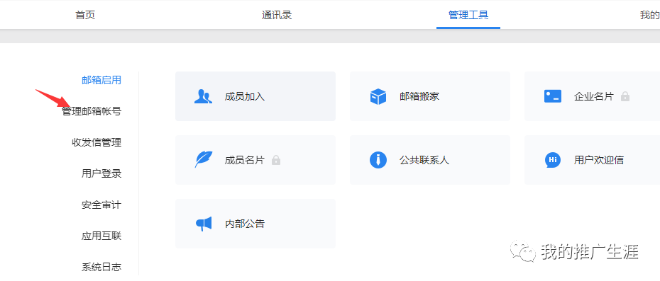你只要點擊右上角的“管理工具”,“管理郵箱賬號”,然后點擊“業務郵箱”