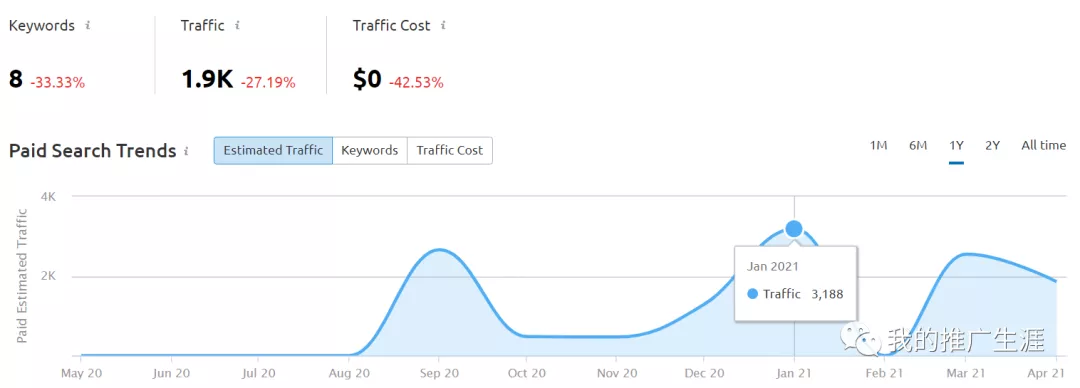 下圖是跑單頁產品的競爭對手網站之一,去年8月份開始投的谷歌廣告,一直投放到現在,高峰期的時候一個月從谷歌搜索引流3k左右,每天也就是100左右的訪客,每天的訂單數可能不多,但是利潤高呀,再說了如果這類方法可以擴展的話,還是很不錯的。