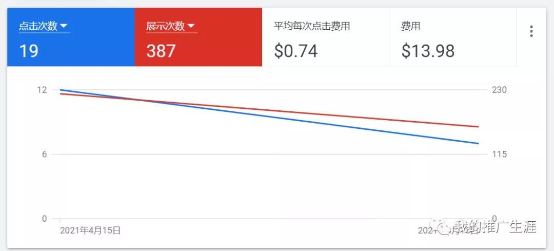 15號總共12個點擊,一個訂單,平均cpc 0.79美元,花費9.43美元。