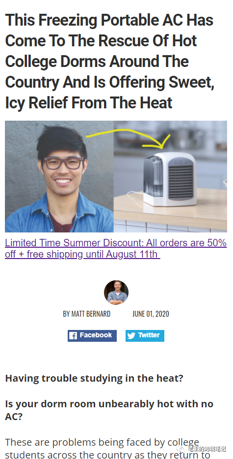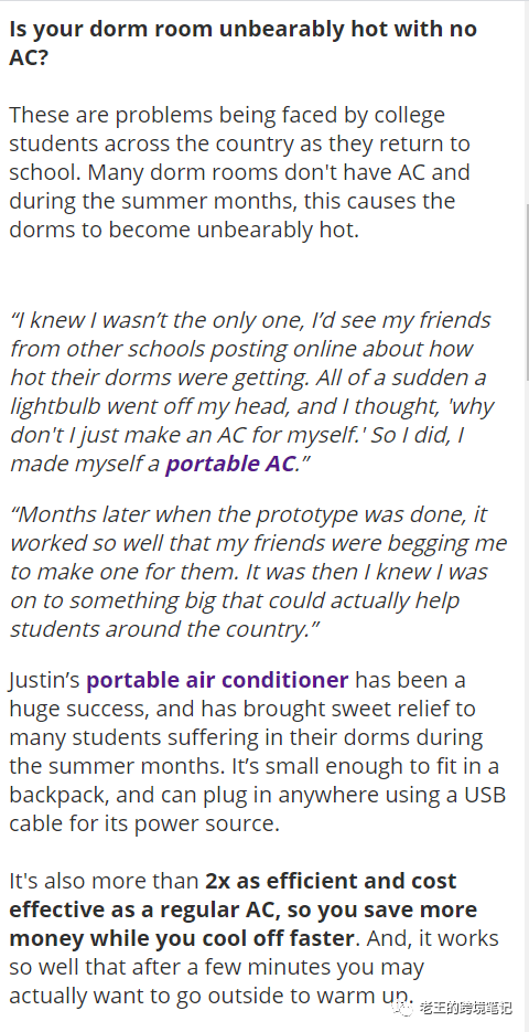 故事講述的是一個麻省理工的大學生發明了移動空調,能很快的降低溫度,他的受眾就是大學生的父母。我沒去國外讀過書,不過據說有的美國大學宿舍沒空調。所以這個產品最終也爆了。 去年我看到公眾號信息流廣告出現了中國版本,他的創意是這種移動空調非常節約電,三天一度電。一個空調管3個房間。 不知道賣的怎么樣。