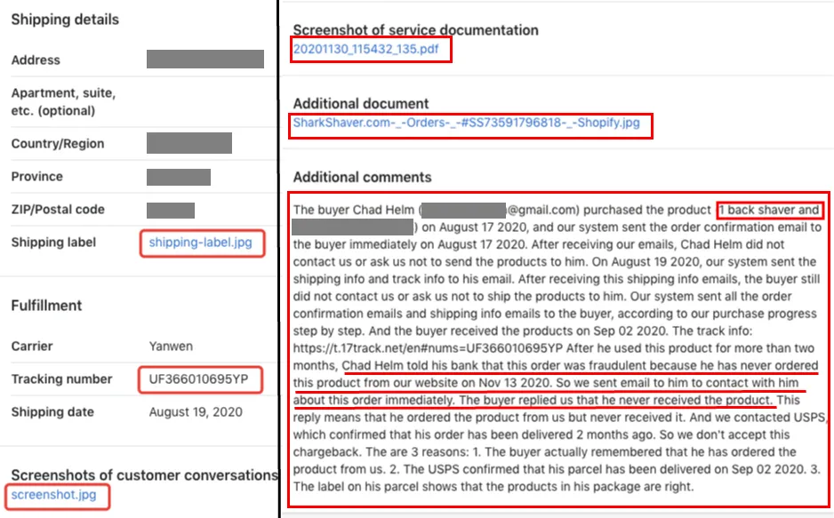 第二,Stripe退單提交資料很多。最近我們剛剛贏了一個退單的勝訴,這是第一次贏退單,好激動!